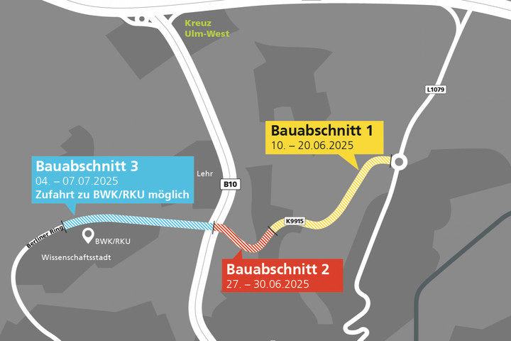 Von 30. Juni 2025 bis 4. Juli 2025 finden Vorarbeiten statt, damit die Zu-/Abfahrt zu BWK und RKU mit einer Ampelanlage ausgestattet wird. Diese Arbeiten werden unter laufendem Verkehr ausgeführt.